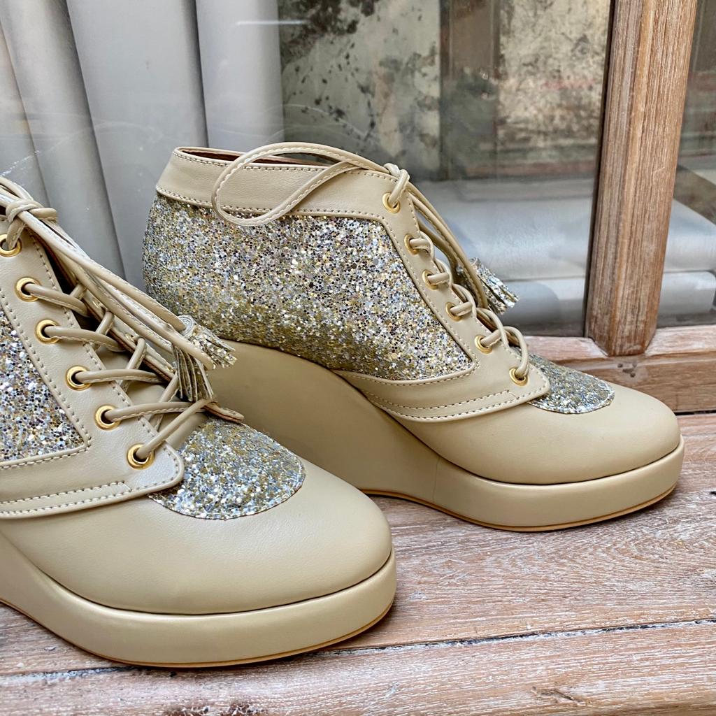 Our Beige Shimmer Light Gold Bridal Sneaker Wedges can be customised in any colour and heel height for the bride to be.
