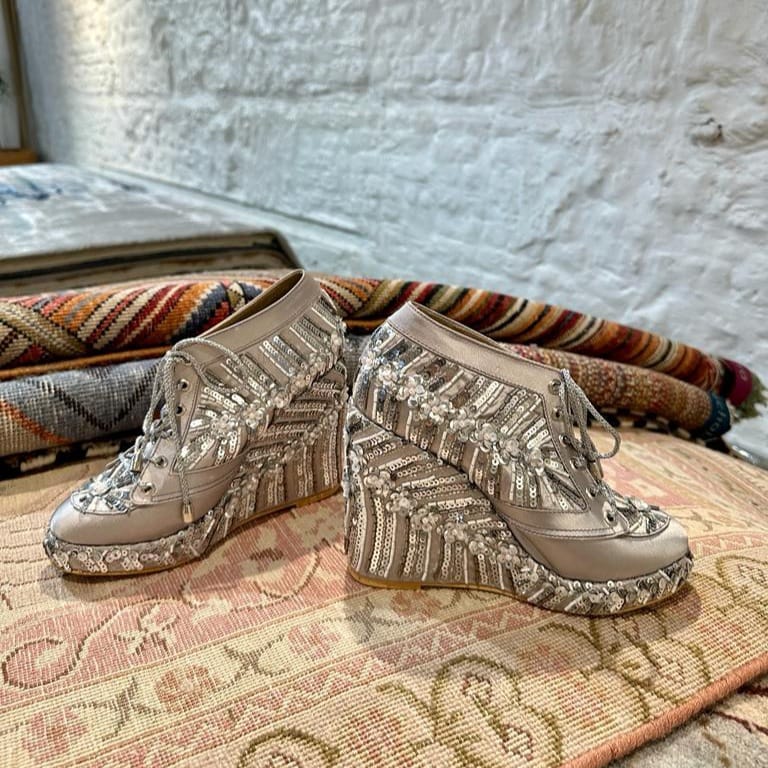 Style with our grey, 4-inch vegan sneaker wedges adorned with handmade embroidery, comfortable for long-hour wear, and perfect to style with Indian lehengas and bridal wear.