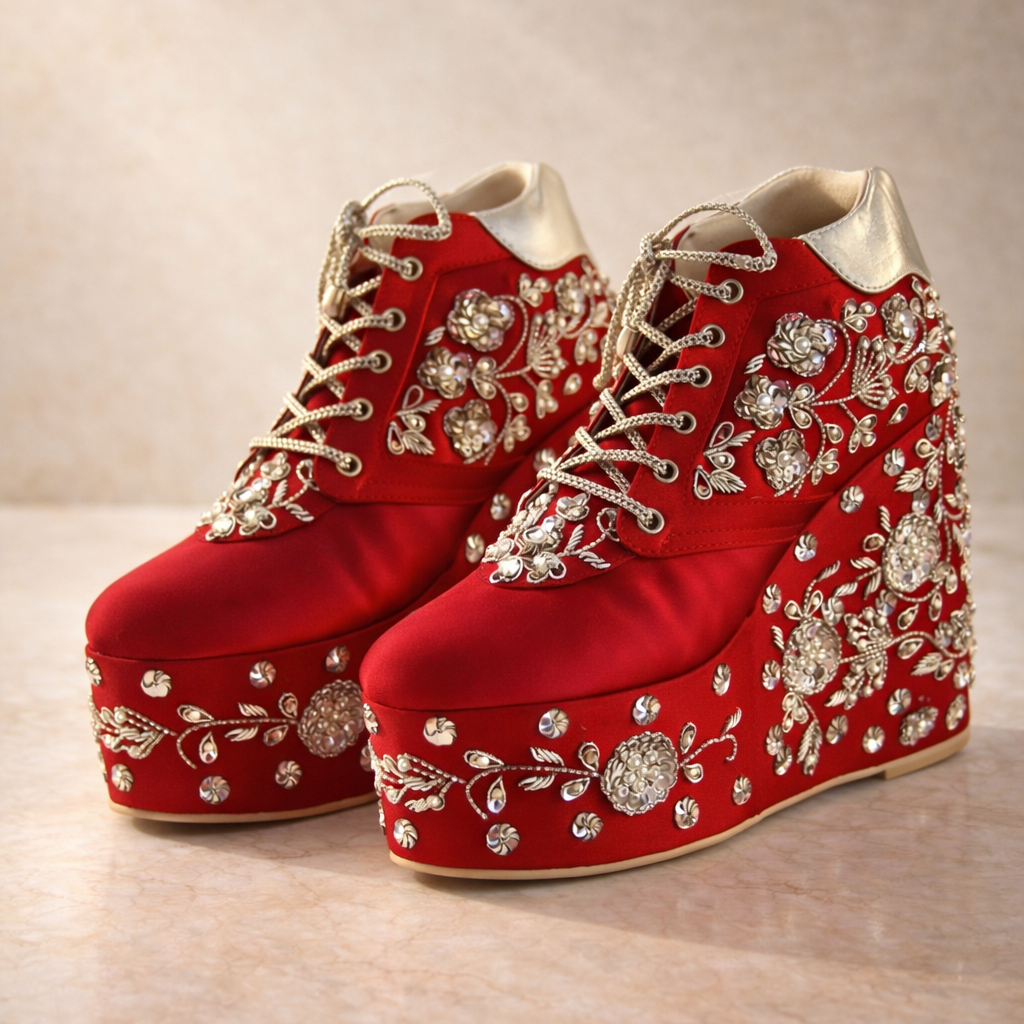 Stand out in every step                                                                                                           These striking red wedge sneakers blend modern comfort with rich festive glamour, featuring intricate mirror work and sparkling crystal embellishments across the upper and wedge. The bold 4.5-inch wedge gives you that perfect height boost while staying stable and easy to wear, ideal for brides and wedding guests who want to dance through haldi, mehendi, or sangeet without switching to heels!