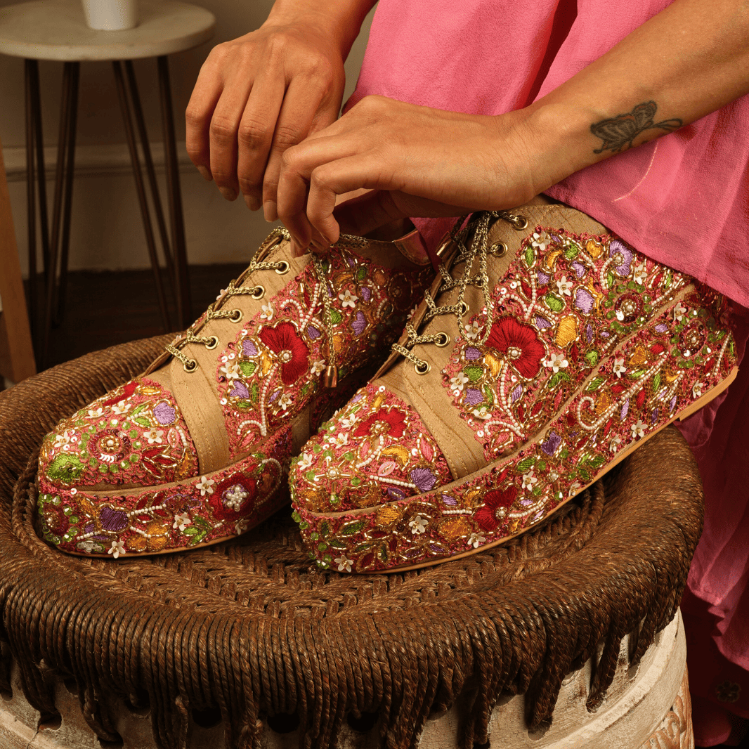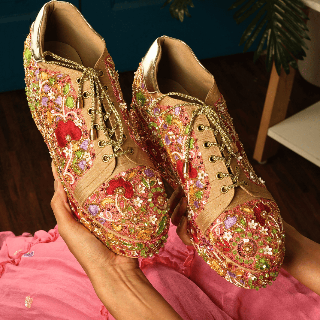 Bloom in style with these multicolor floral-embroidered wedge sneakers, a garden of beads, sequins, and blossoms at your feet!
