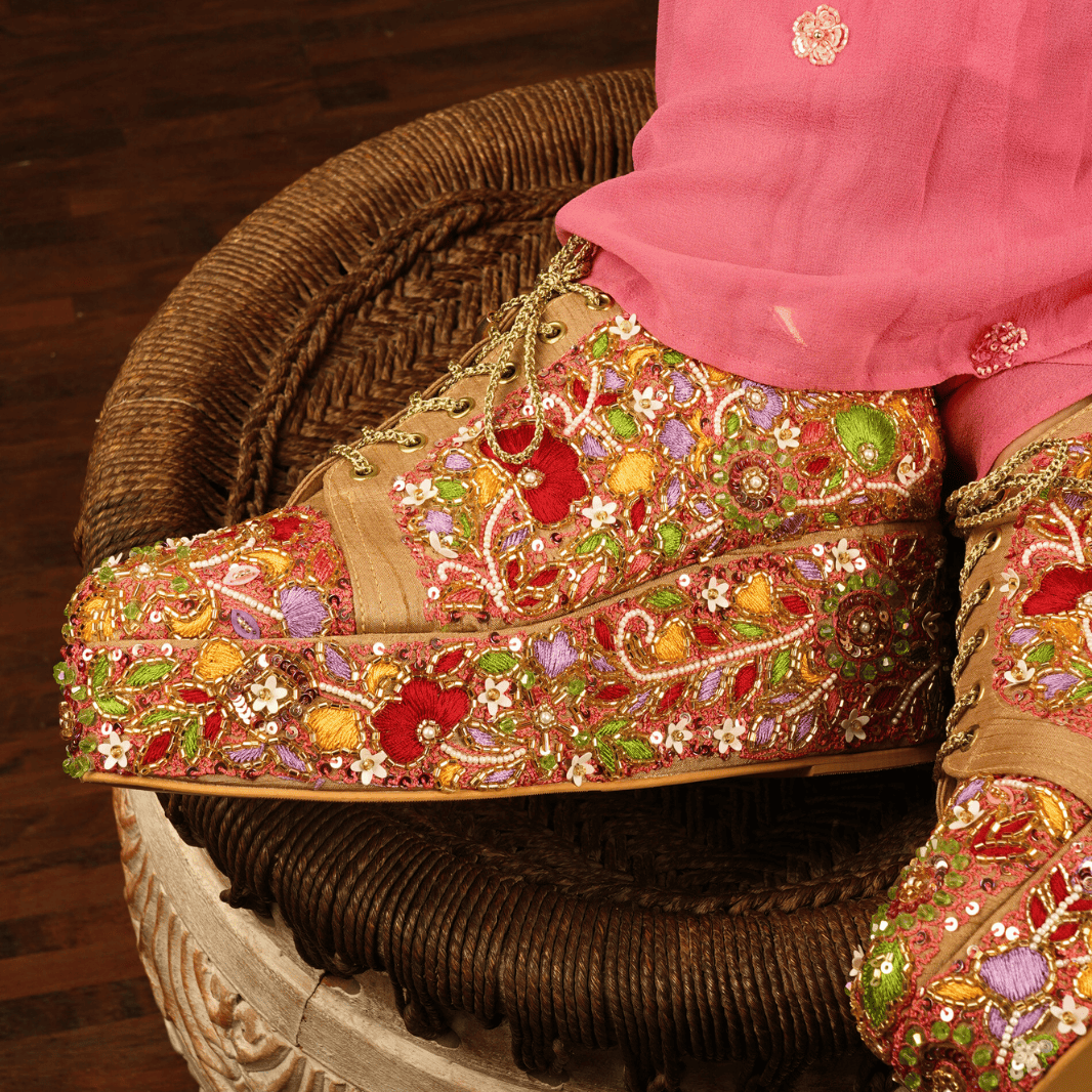 Custom Golden Multi Colour flower embroidery Bridal Sneaker platforms.
