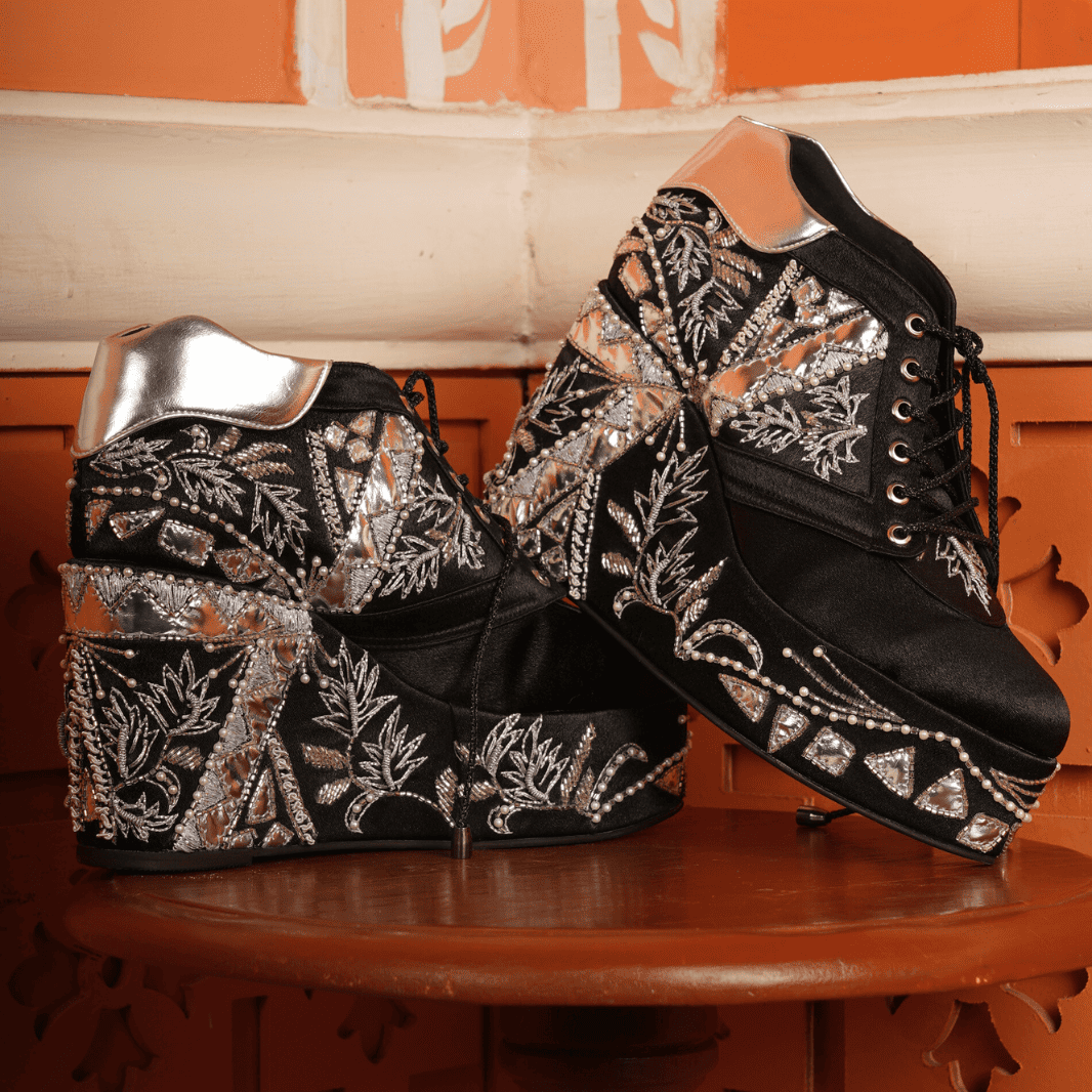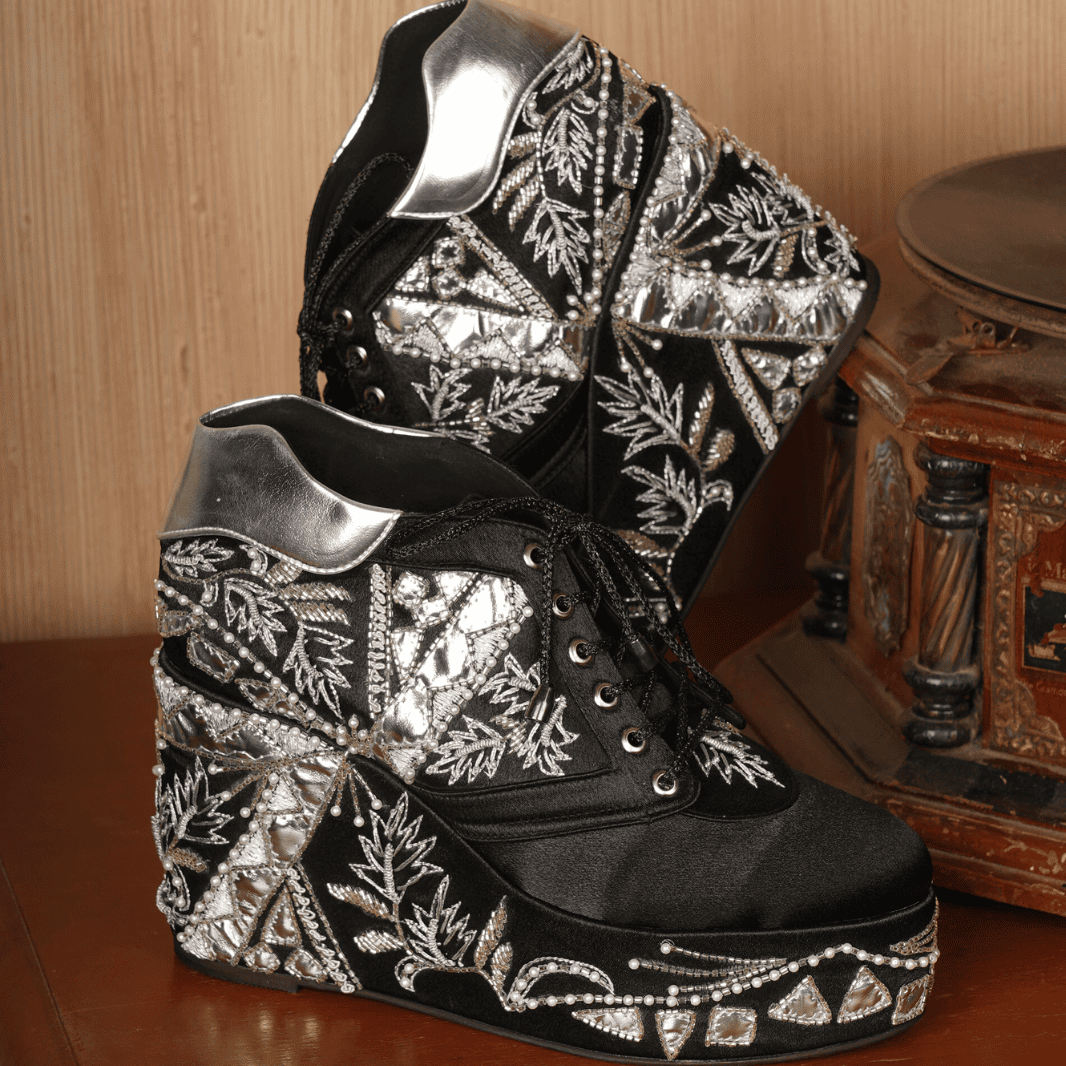 Shine bright with these black satin wedge sneakers decked out in silver sequins, beads, and mirror embroidery – total desi glam meets street style!