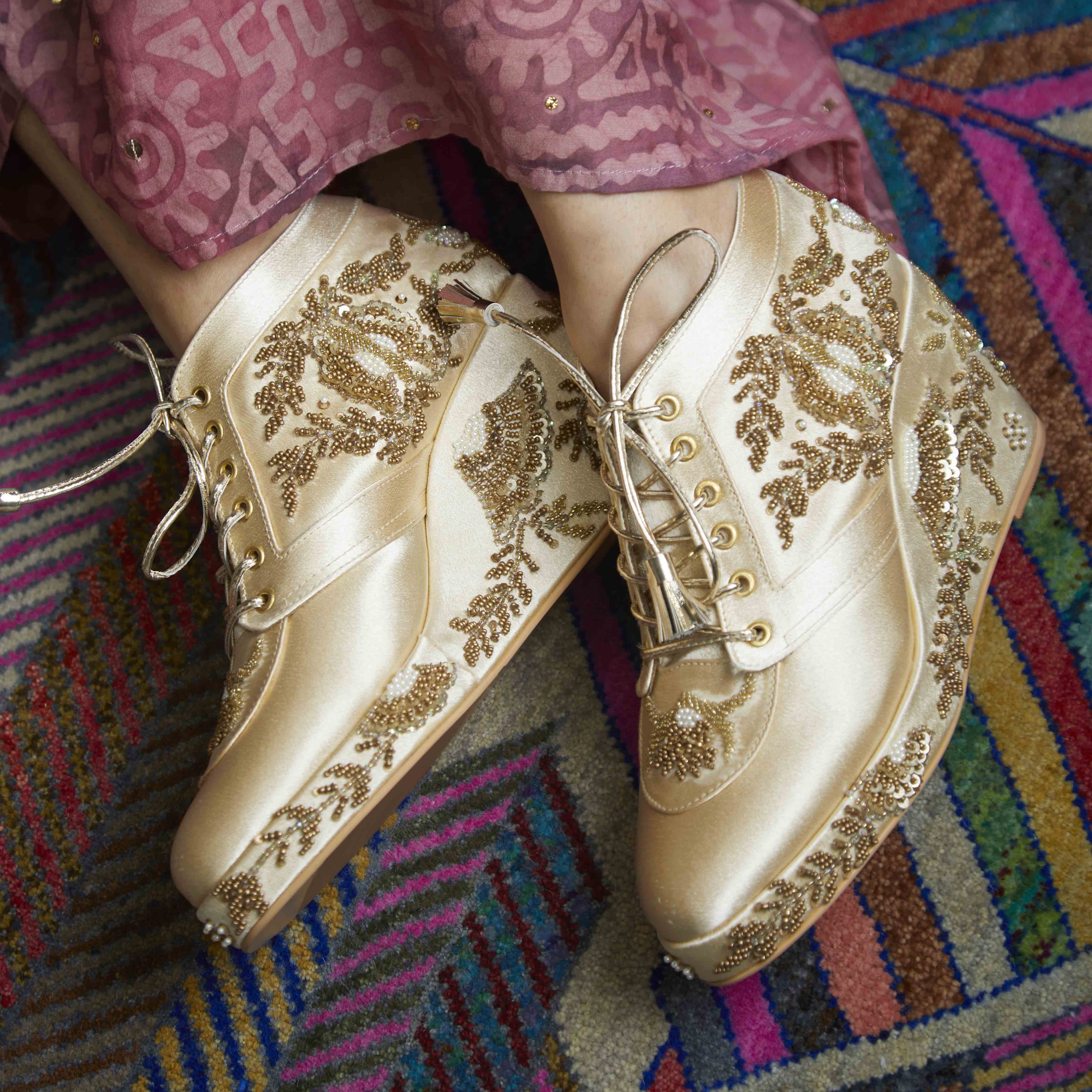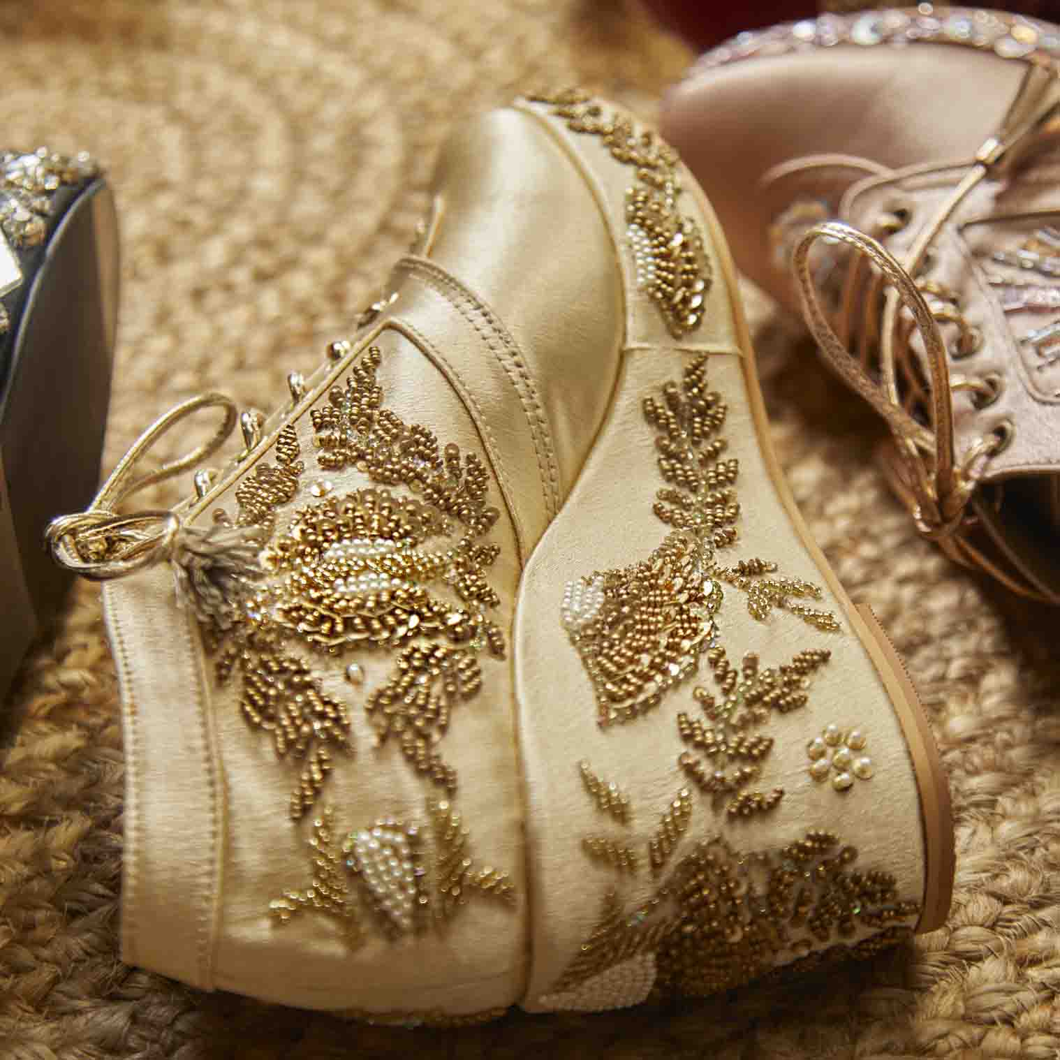 Our Gold Satin Embroidered Bridal Sneaker Wedges can be customised in any colour and heel height for the bride to be.