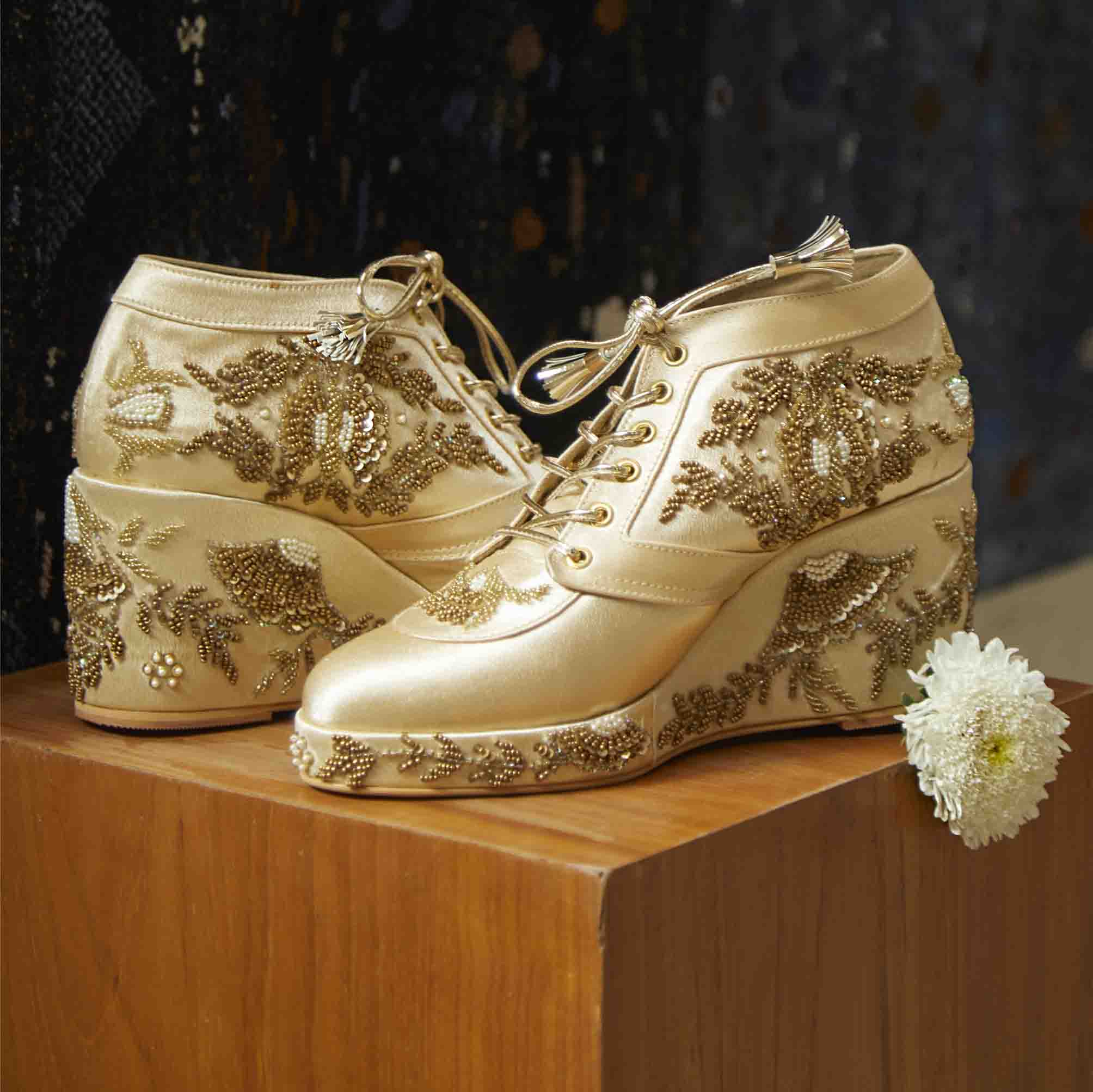 Gold Satin Embroidered Bridal Sneaker Wedges - Customized Wedding Shoes | Tiesta