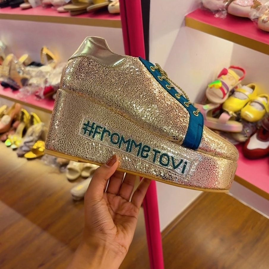 Say hello to Write Your Magic — the glittery gold wedge sneaker that lets you add your own personal touch! ✨ With its shimmering base, bold teal detailing and comfy 3-inch wedge, this pair gives you glam, height and total comfort in one go.