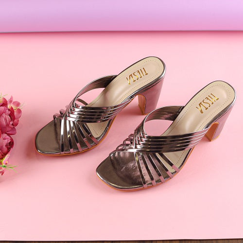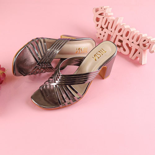 The metallic finish comfy grey strappy versatile block heels are a stylish and practical addition to any wardrobe. The comfortable block heels ensures that they can be worn for extended periods without causing any discomfort.