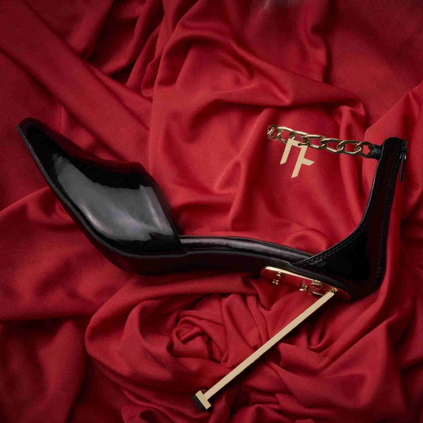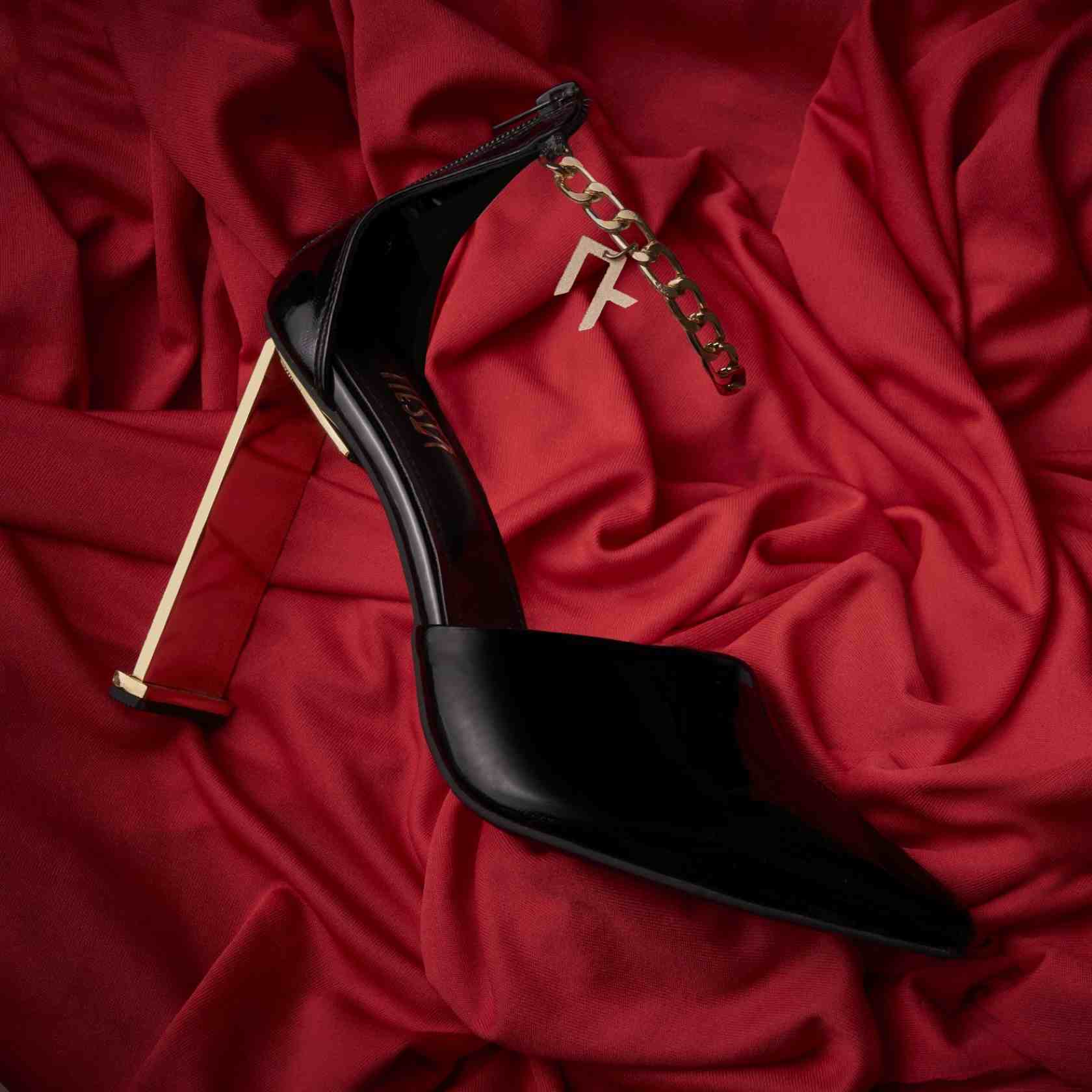 "Dainty closed upper adorned with a gold chain encircling the ankle with Nikhil Thampi Logo, featuring ultra-sleek metal heels."
