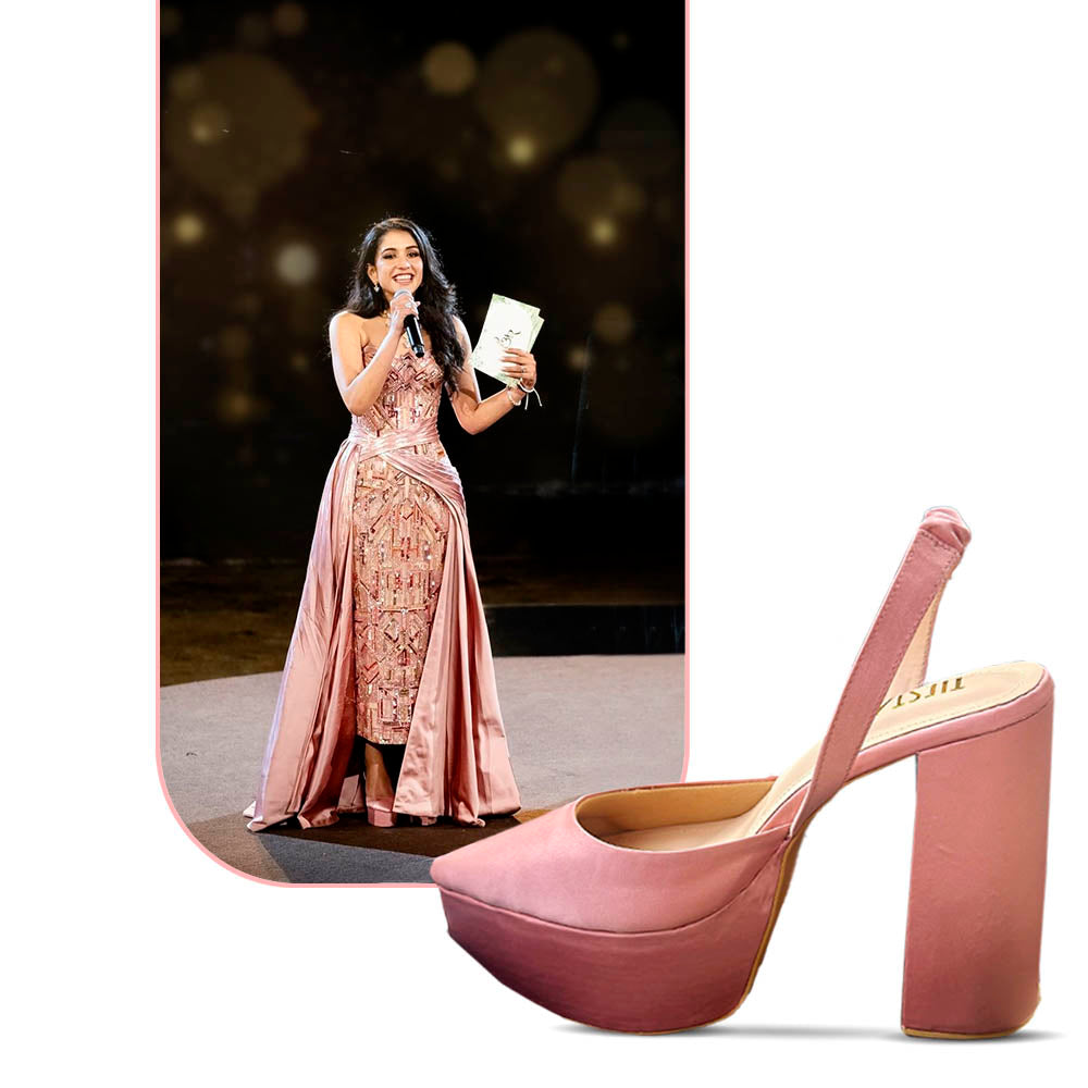 Radhika Merchant Stuns in her Custom Tiesta 5-inch block heels, meticulously matched to her breathtaking Versace gown for the pre-wedding celebration.