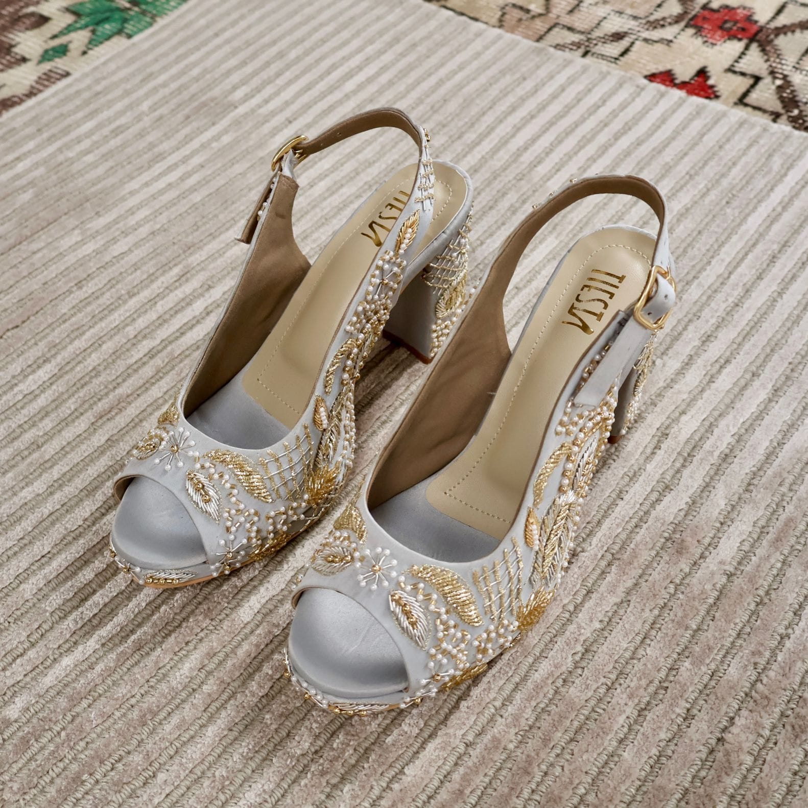 Sabya Grey Hand Embroidered Slingback bridal block heels I Tiesta