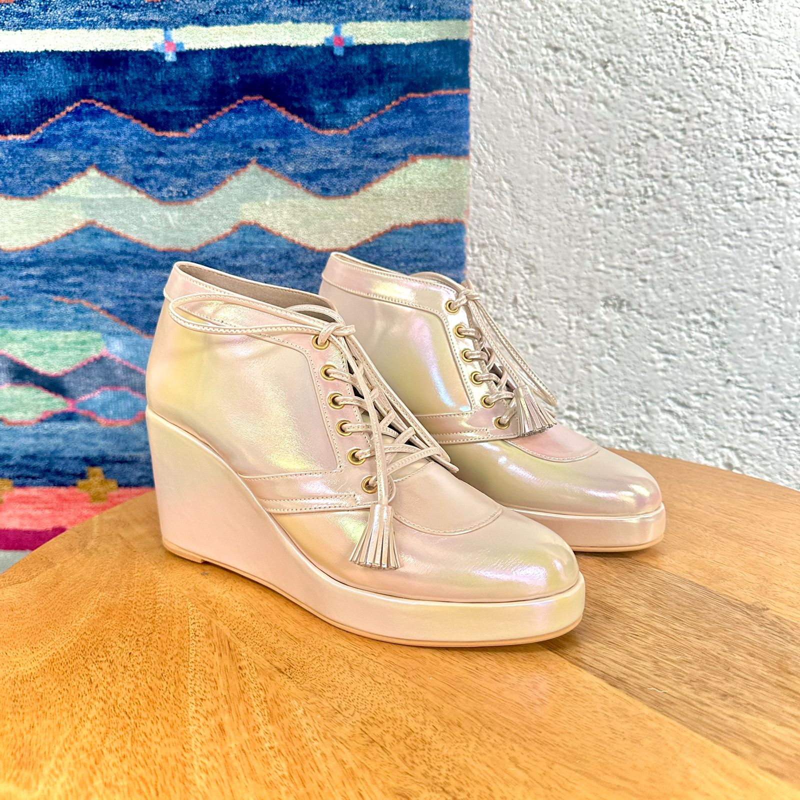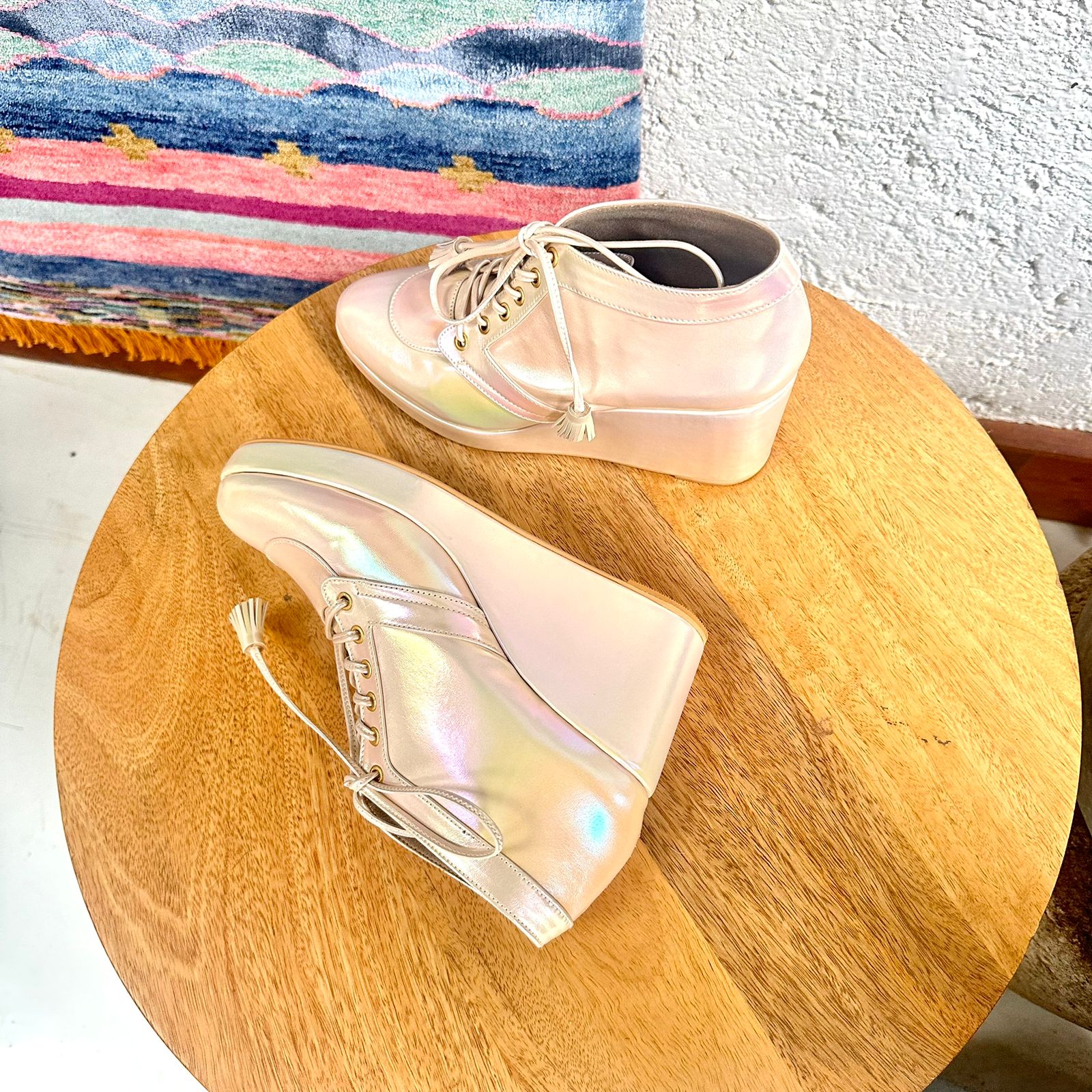 Break all the fashion rules and embrace comfort with style with our stunning Light gold Holographic Sneaker Wedges.