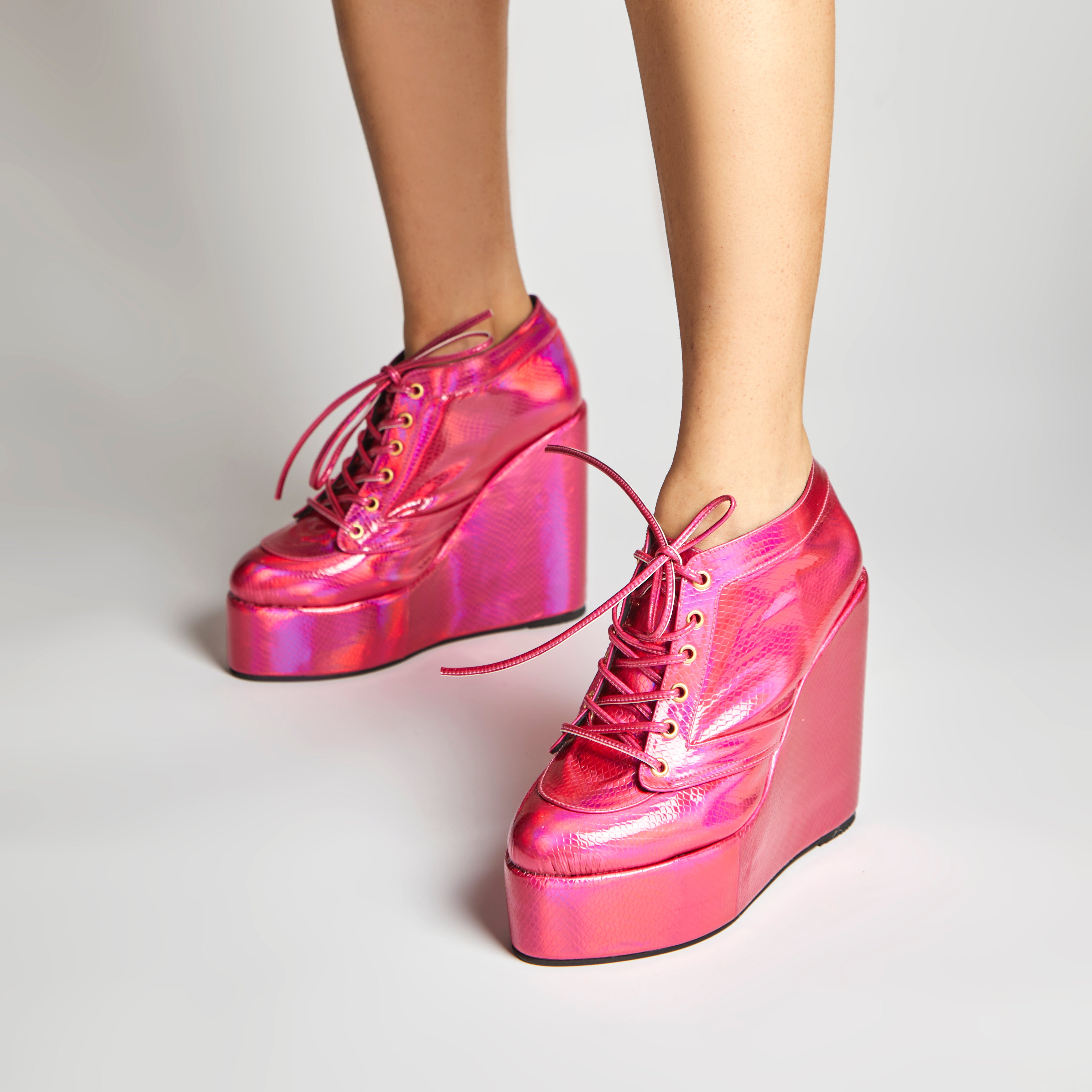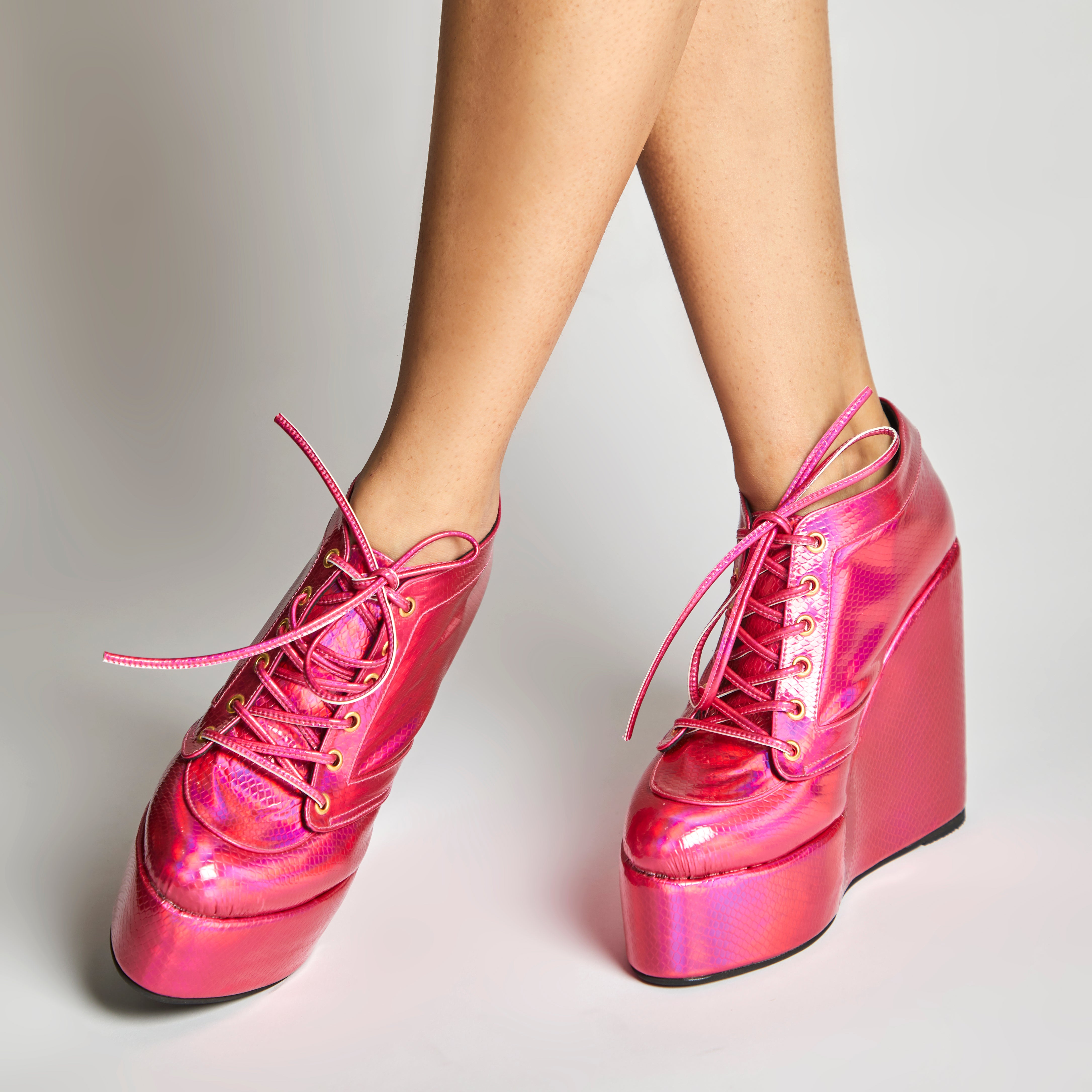 Break all the fashion rules and embrace comfort with style with our stunning black patent sneaker wedges.