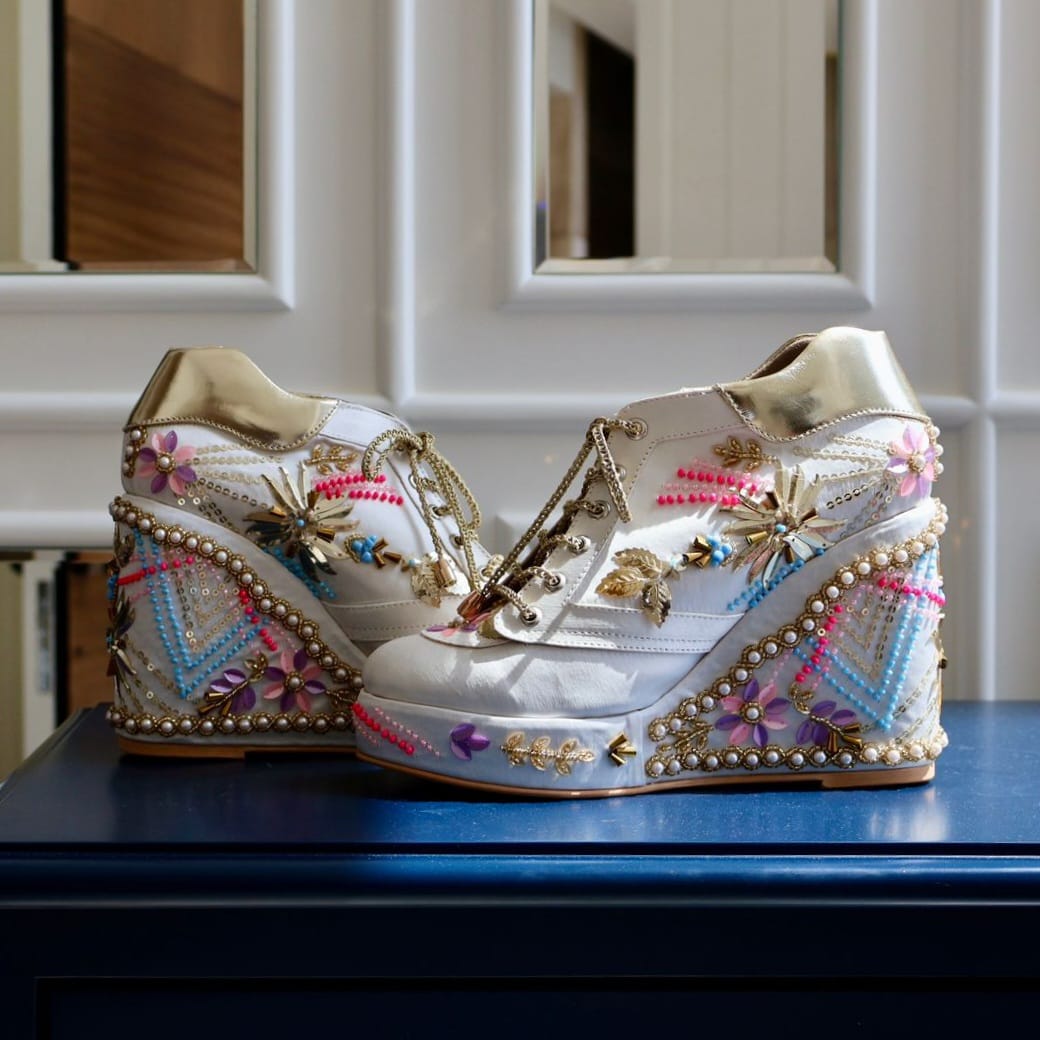 Elegant muti-colored embroidered satin wedding sneaker wedges for your special day, crafted for lasting comfort with cushion on ankle. Celebrate in style and dance freely in our fully customizable sneaker wedges.